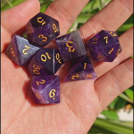 - This dice set is made from amethyst gemstone and it contains 7 dice: 1* D4, 1*D6, 1*D8, 1*D12, 1*D20, 2*D10 (D10 & D00), which are packed in a black rectangular cardboard box. The black sponge with 7 grids in the cardboard box can not only protect the dice well during transportation, but also serve as a perfect gift to you and in the hands of your loved ones.