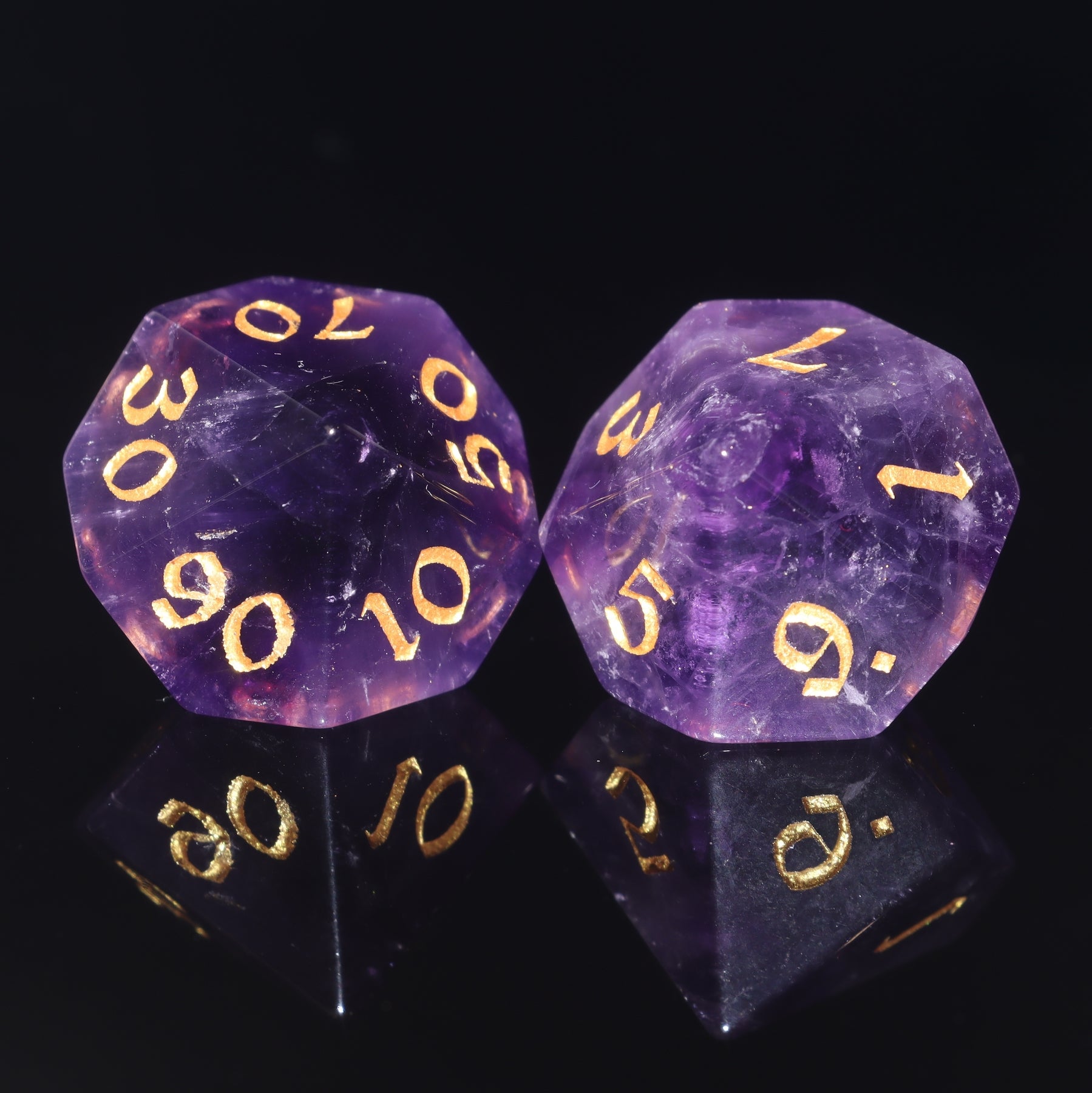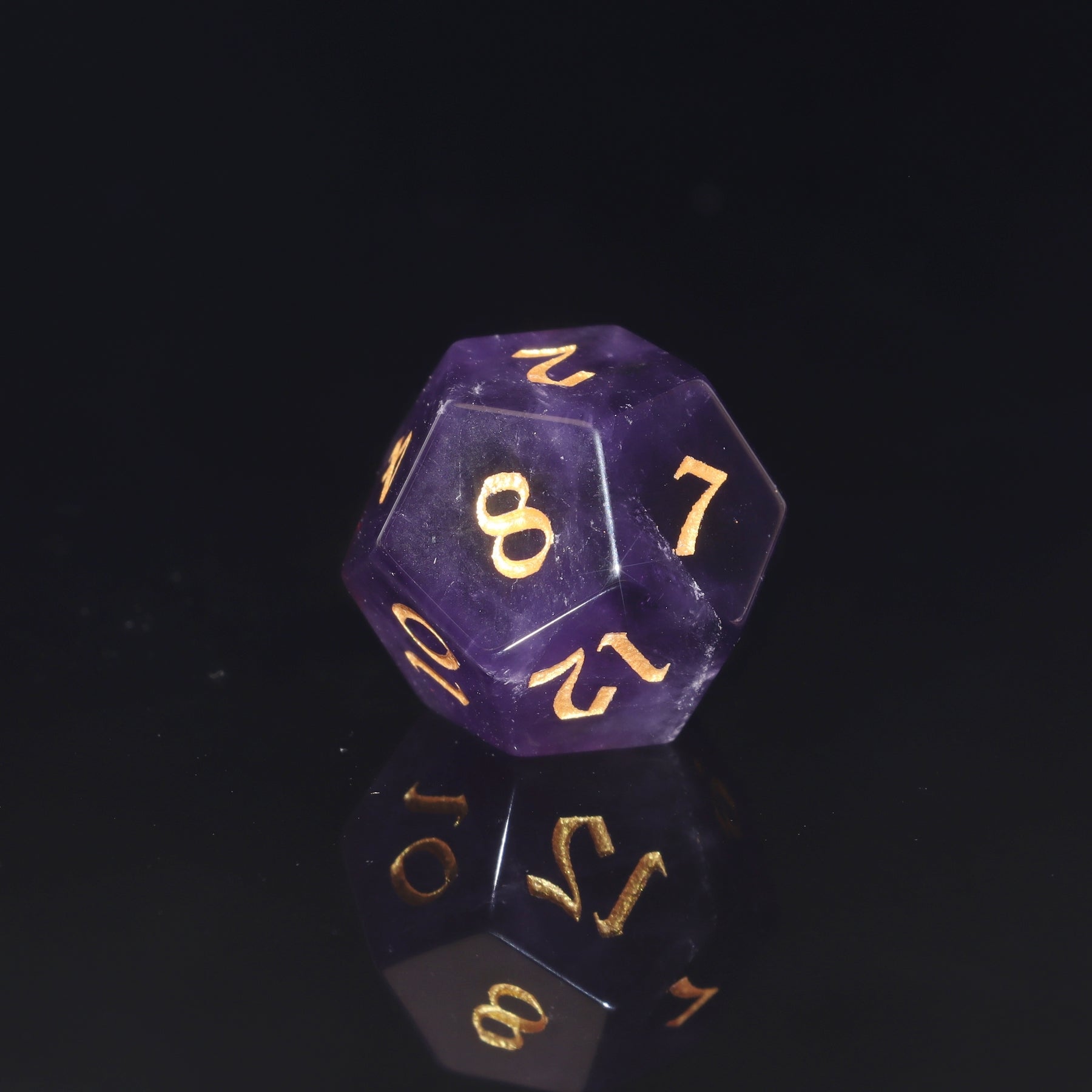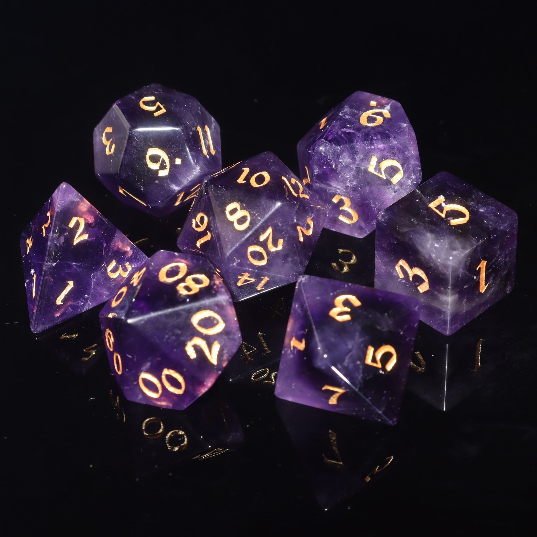 - This dice set is made from amethyst gemstone and it contains 7 dice: 1* D4, 1*D6, 1*D8, 1*D12, 1*D20, 2*D10 (D10 & D00), which are packed in a black rectangular cardboard box. The black sponge with 7 grids in the cardboard box can not only protect the dice well during transportation, but also serve as a perfect gift to you and in the hands of your loved ones.