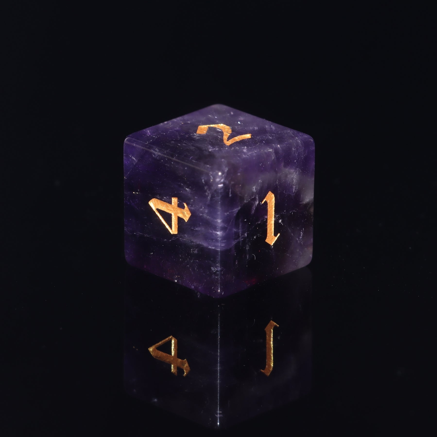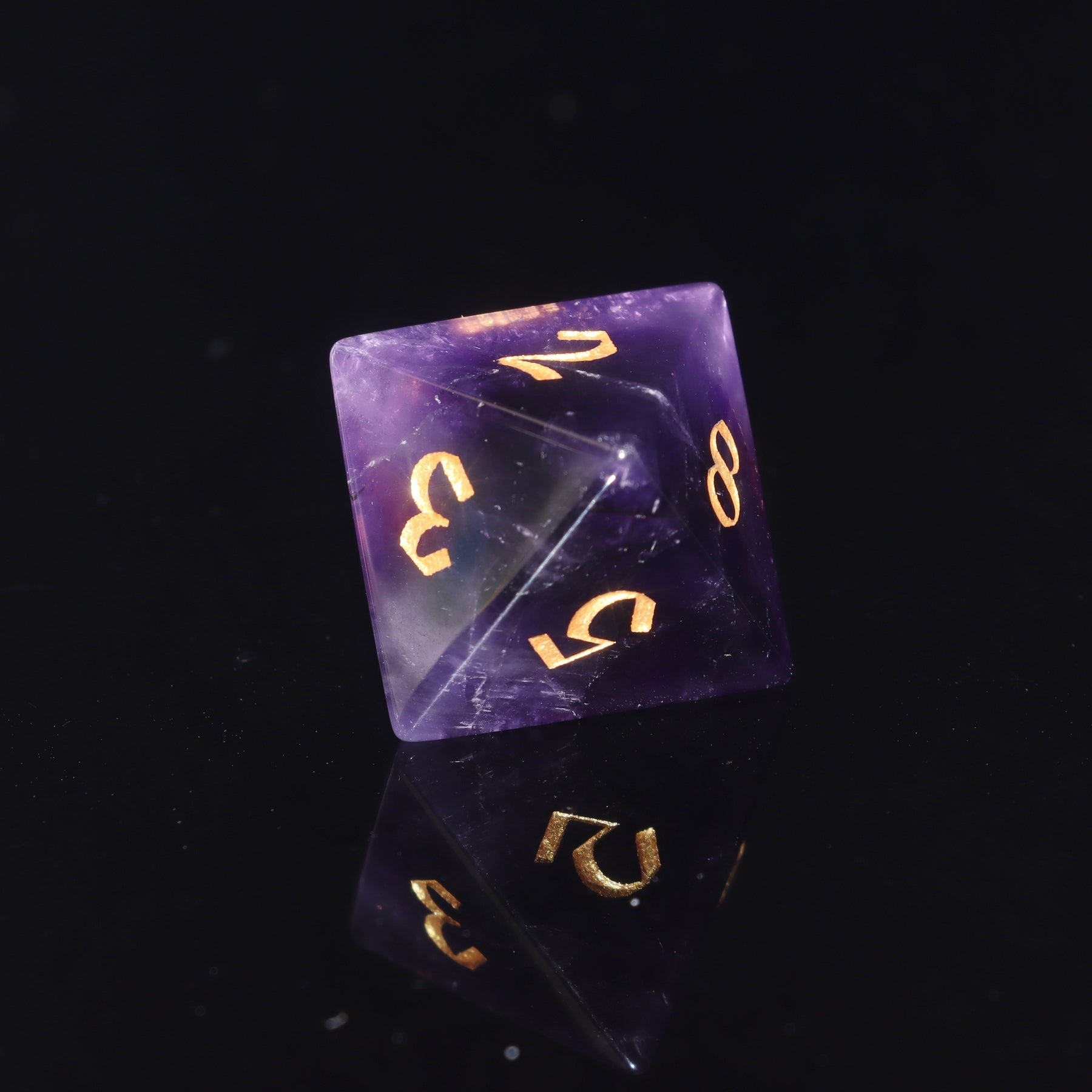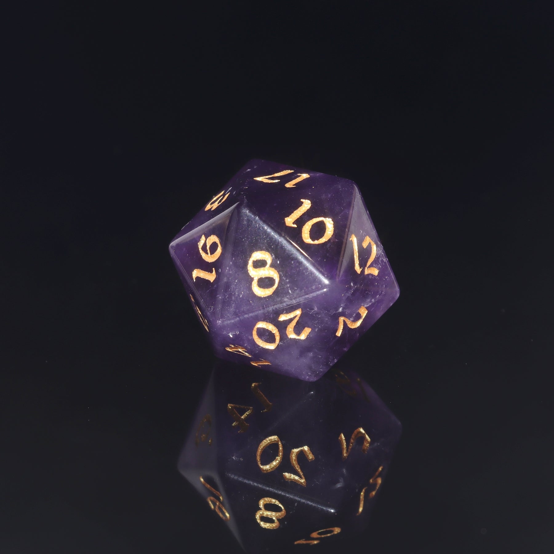 - This dice set is made from amethyst gemstone and it contains 7 dice: 1* D4, 1*D6, 1*D8, 1*D12, 1*D20, 2*D10 (D10 & D00), which are packed in a black rectangular cardboard box. The black sponge with 7 grids in the cardboard box can not only protect the dice well during transportation, but also serve as a perfect gift to you and in the hands of your loved ones.