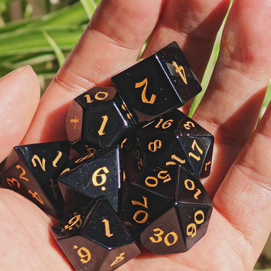 - This dice set is made from black obsidian natural gemstone and it contains 7 dice: 1* D4, 1*D6, 1*D8, 1*D12, 1*D20, 2*D10 (D10 & D00), which are packaged in a black rectangular cardboard box. The black sponge with 7 grids in the cardboard box can not only protect the dice well during transportation; but also serve as a perfect gift to you and in the hands of your loved ones.