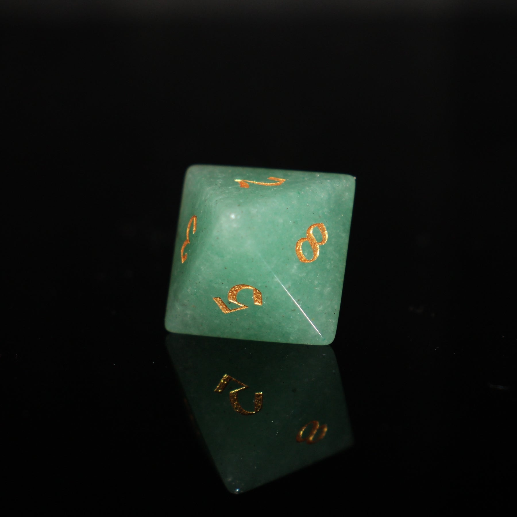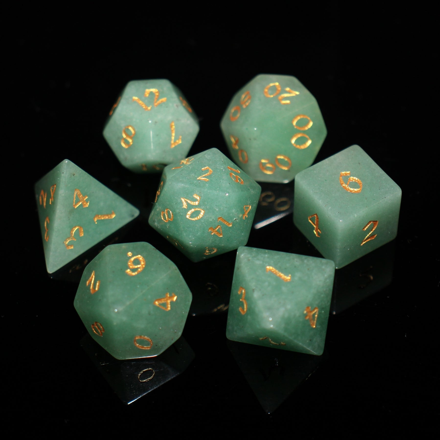 - This gemstone DICE Set is a set of 7 full-sized polyhedral dice, containing 1* D4, 1*D6, 1*D8, 1*D12, 1*D20, 2*D10 (D10 & D00). Each die is hand-made from green aventurine, individually cut, then polished, and engraved with shiny gold numbers.