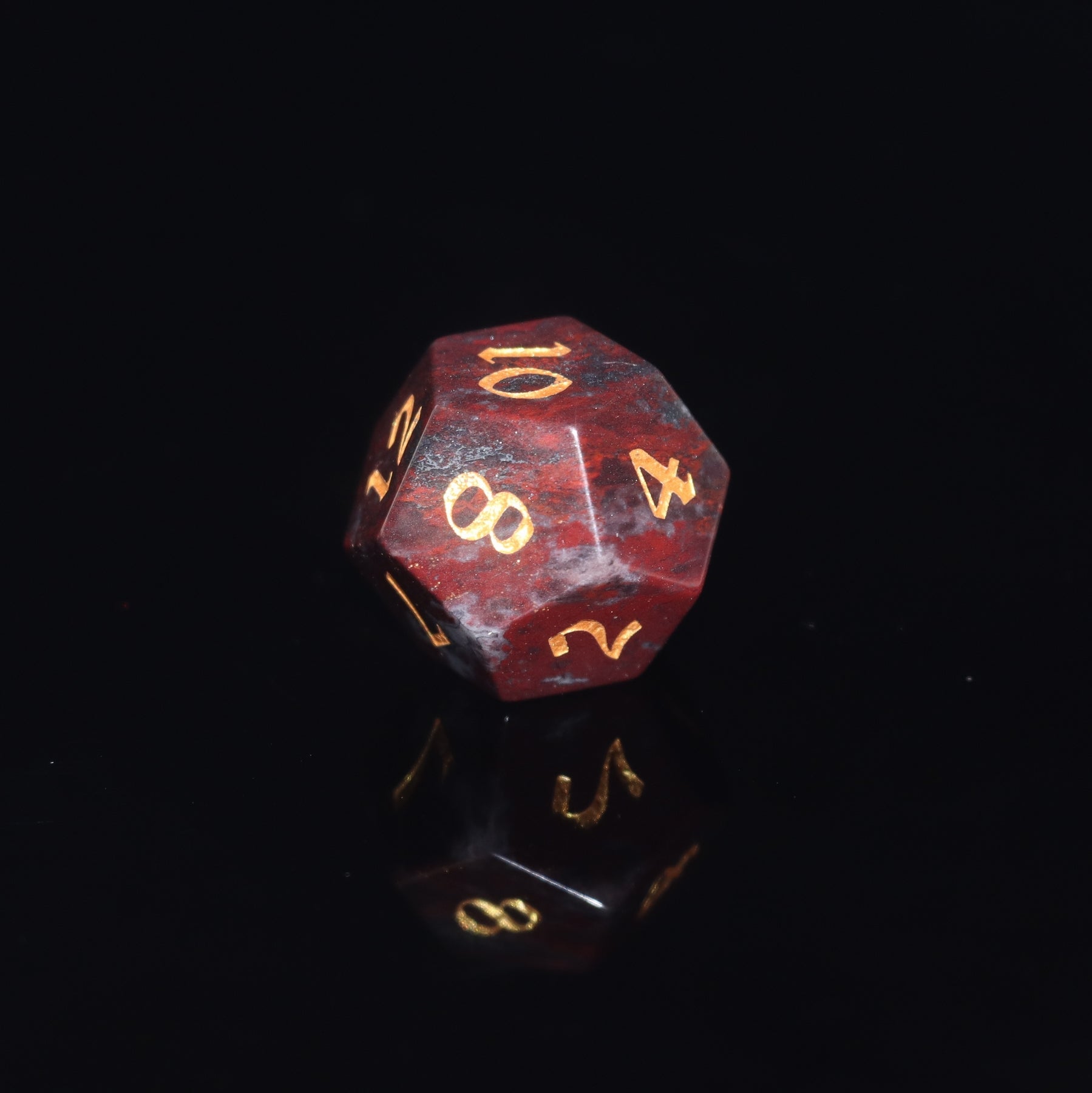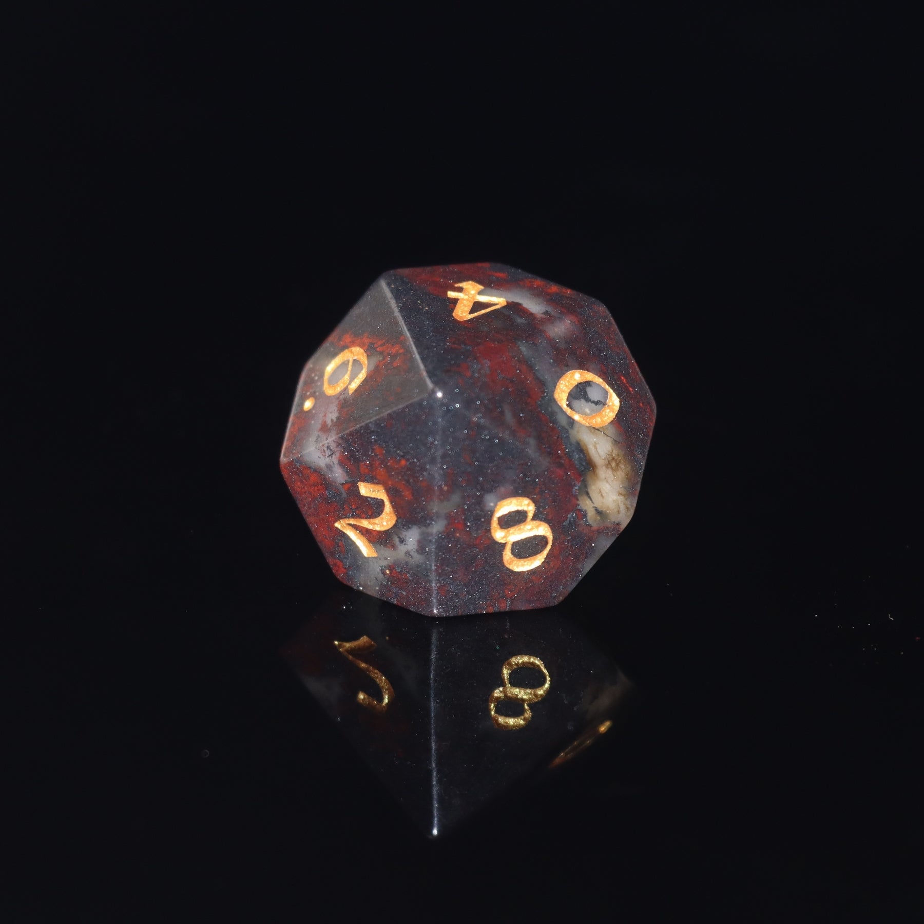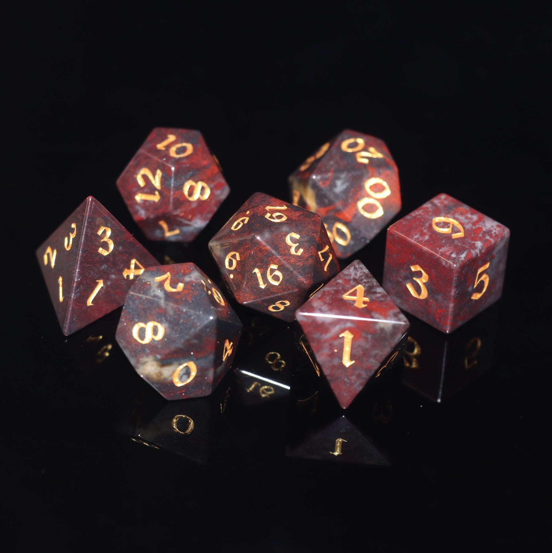 - This polyhedral DND Dice set is made from natural African blood gemstone. Each set contains 7 dice: 1* D4, 1*D6, 1*D8, 1*D12, 1*D20, and 2*D10 (D10 & D00), which are packed in a black rectangular cardboard box. The black sponge with 7 grids in the cardboard box can not only protect the dice well during transportation; but also serve as a perfect gift to you and in the hands of your loved ones.