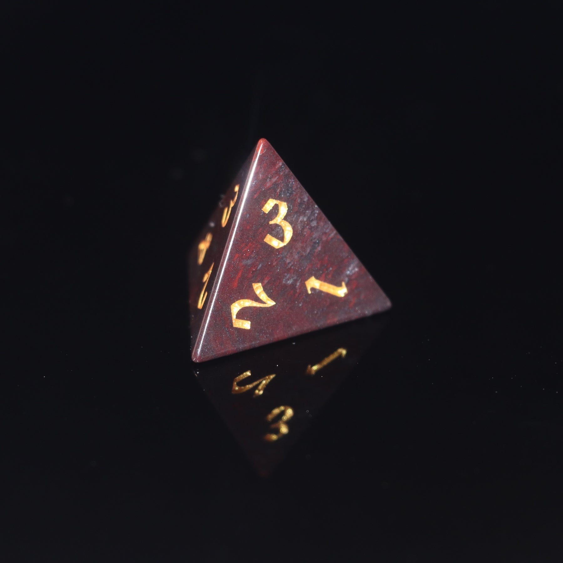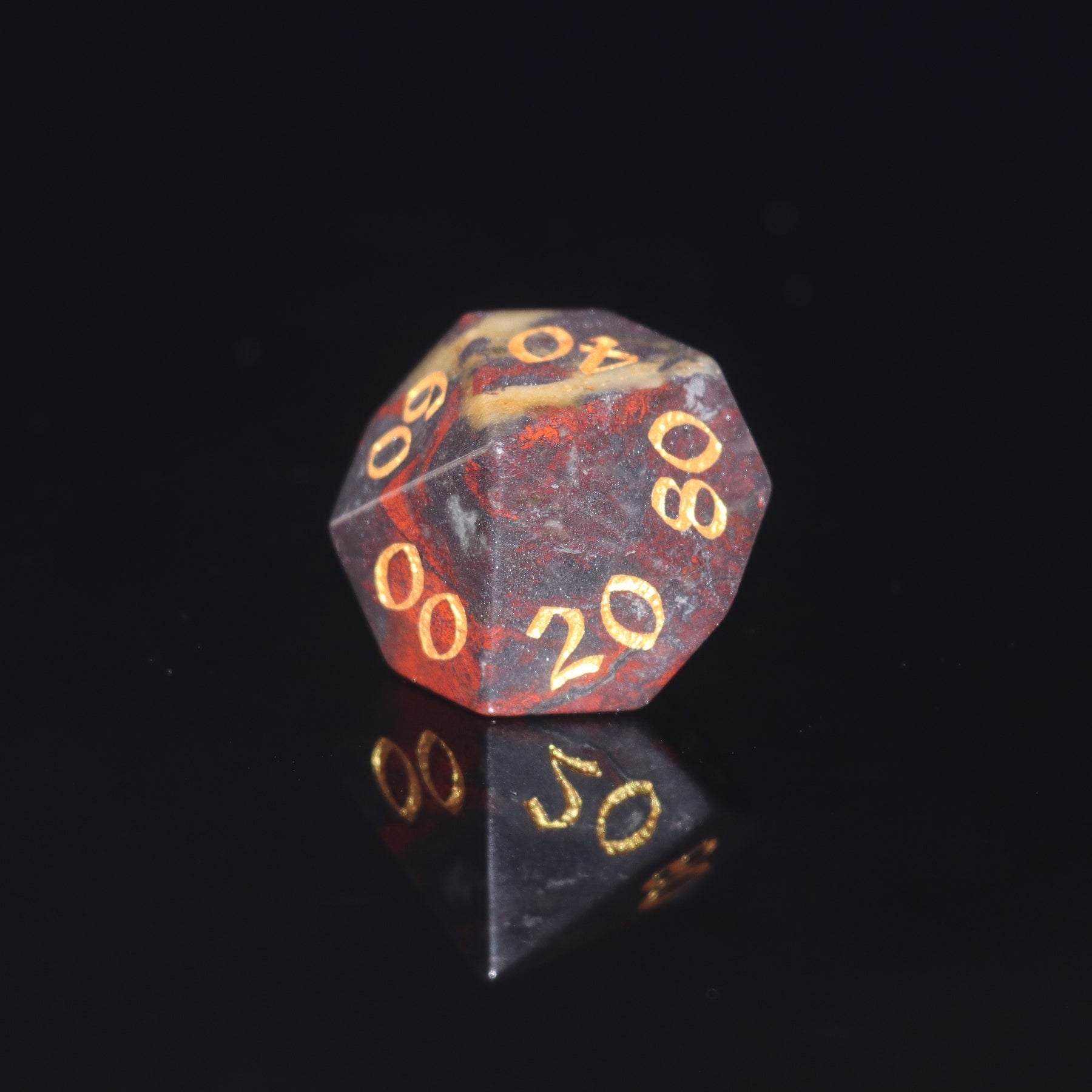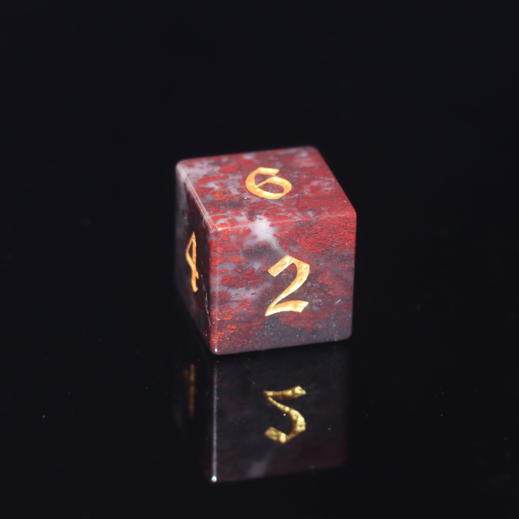- This polyhedral DND Dice set is made from natural African blood gemstone. Each set contains 7 dice: 1* D4, 1*D6, 1*D8, 1*D12, 1*D20, and 2*D10 (D10 & D00), which are packed in a black rectangular cardboard box. The black sponge with 7 grids in the cardboard box can not only protect the dice well during transportation; but also serve as a perfect gift to you and in the hands of your loved ones.