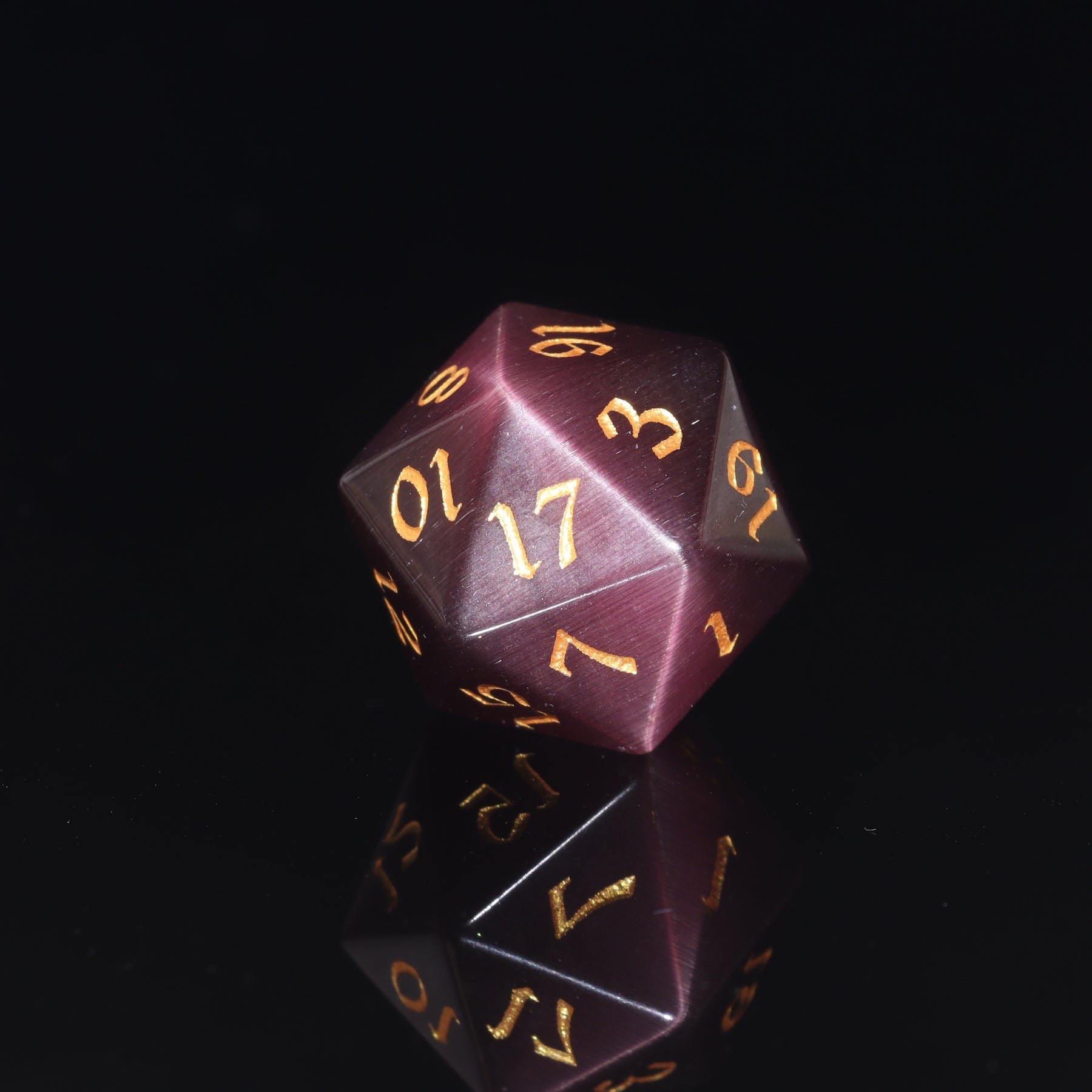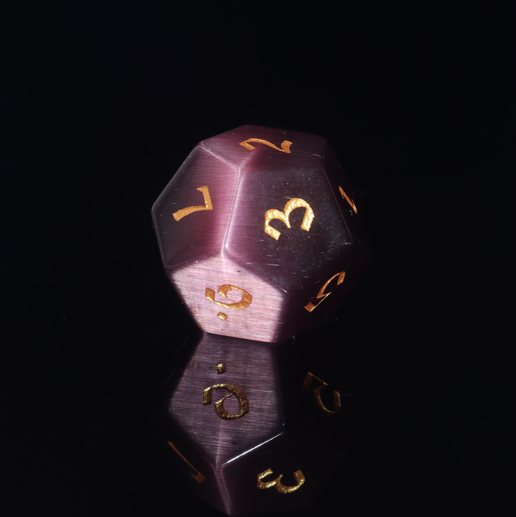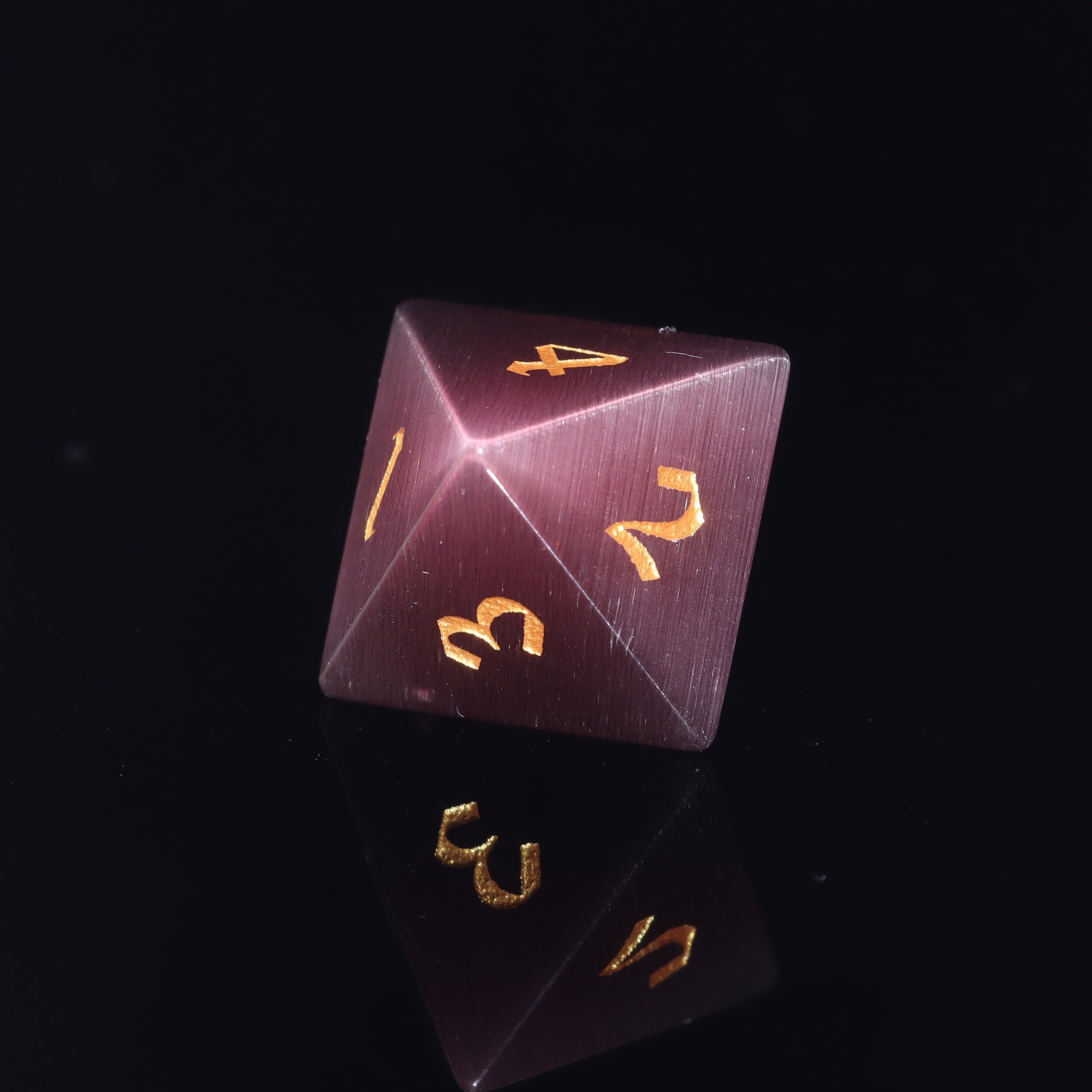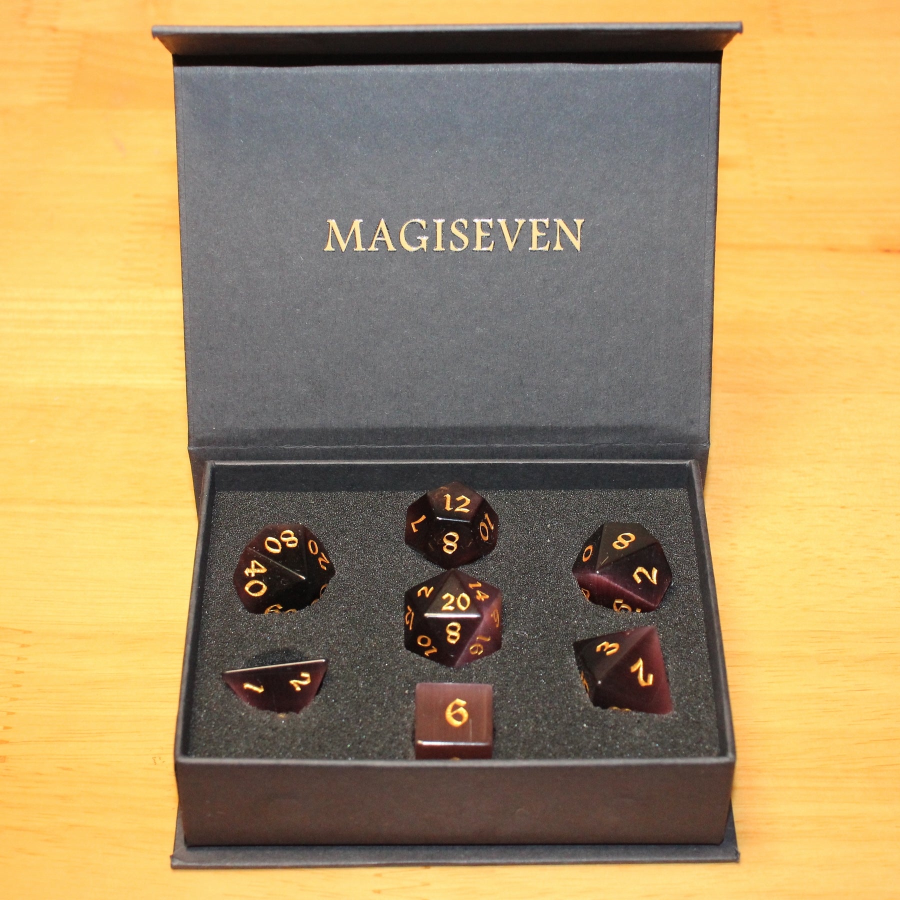 - This dice set is made from purple cats' eye gemstone and it contain 7 dice: 1* D4, 1*D6, 1*D8, 1*D12, 1*D20, 2*D10 (D10 & D00), packaged in a black rectangular cardboard box. The black sponge with 7 grids in the cardboard box can not only protect the dice well during transportation; but also serve as a perfect gift to you and in the hands of your loved ones.